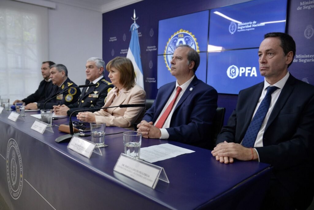 La ministra de Seguridad Nacional, Patricia Bullrich, brindó una conferencia de prensa para dar detalles de la operación internacional que culminó con el decomiso de 510 kilogramos de cocaína ocultos en un torno industrial, además de múltiples detenciones en Argentina y España.
